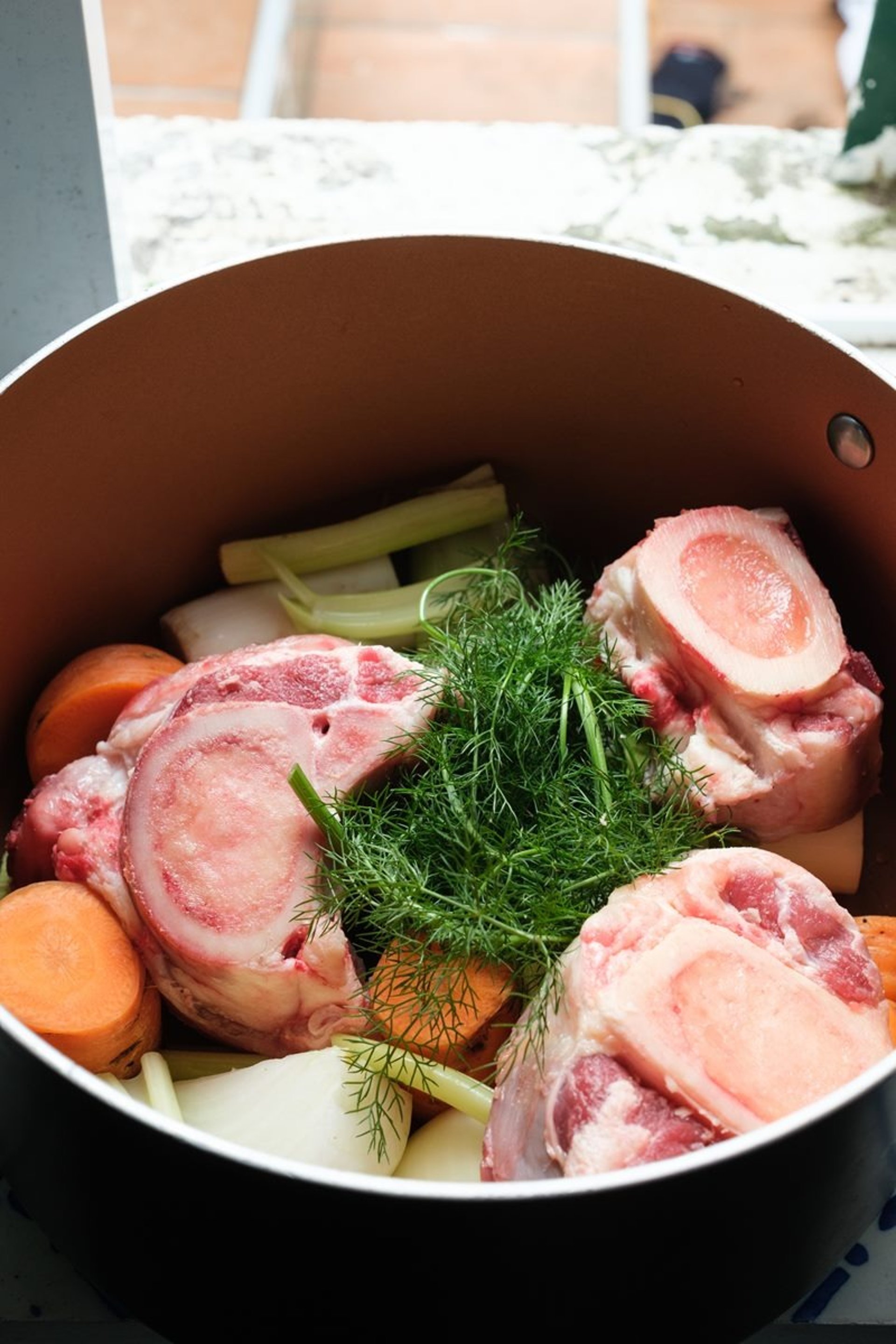 Coe o caldo (descarte os ossos), leve à geladeira para separar a gordura solidificada e retire-a, se preferir uma versão menos gordurosa.