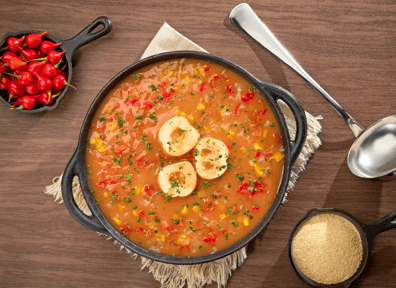 Esse caldo é feito a partir do cozimento do osso e das partes cartilaginosas das patas do boi, mais conhecido como mocotó. É um alimento “denso em gelatina natural — rica em colágeno dos tipos I e II, os mesmos presentes na pele, tendões e articulações humanas.”